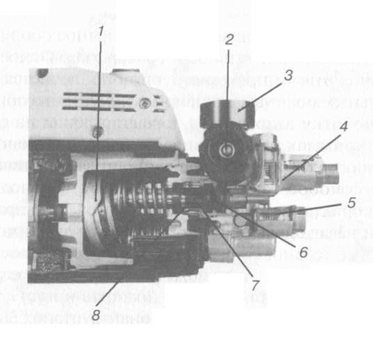 1 – привод; 2 – регулятор давления; 3 – манометр; 4 – головка насоса; 5 – впускной клапан; 6 – возвратный клапан; 7 – защитное покрытие от сухого включения и избыточного давления; 8 – трёхосевой плунжерный насос.