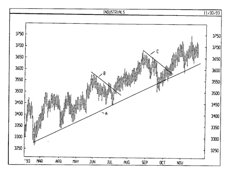 Вторичные тенденции — это промежуточные, корректирующие движения рынка, обратные основной тенденции. Они обычно продолжаются один-три месяца, и за это время рынок отступает на одну-две третьих длины предыдущей основной тенденции. На следующем графике показаны основная тенденция (линия А) и вторичные тенденции (В и С).