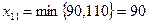 Для составления первоначального плана обращаемся к клетке (1, 1). Запасы для нее равны 90, потребности—110. Меньшее из этих чисел считаем перевозкой по маршруту (1, 1):