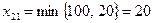 Затем берем клетку (2, 1)— северо-западный угол оставшейся части таблицы. Для нее запасы равны 100, а потребности — только 20. Меньшее число будет перевозкой по маршруту (2, 1):