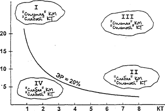 Идеальная позиция тяготеет к зоне III, но на практике соединить высокую КМ с высоким КТ бывает, как правило, очень трудно, так как при наращивании оборота КТ увеличивается, а КМ снижается, если только, как было отмечено выше, НРЭИ не возрастает быстрее оборота. У большинства предприятий показатели располагаются между I и II зонами. При этом любое снижение к IV зоне опасно, так как грозит падением экономической рентабельности.