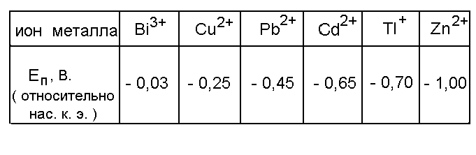 Таблица. Значения потенциалов анодных пиков некоторых ионов металлов на фоне 0,1 М НСl