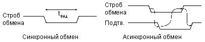 При синхронном обмене процессор заканчивает обмен данными самостоятельно, через раз и навсегда установленный временной интервал выдержки (tвыд), то есть без учета интересов устройства-исполнителя;
