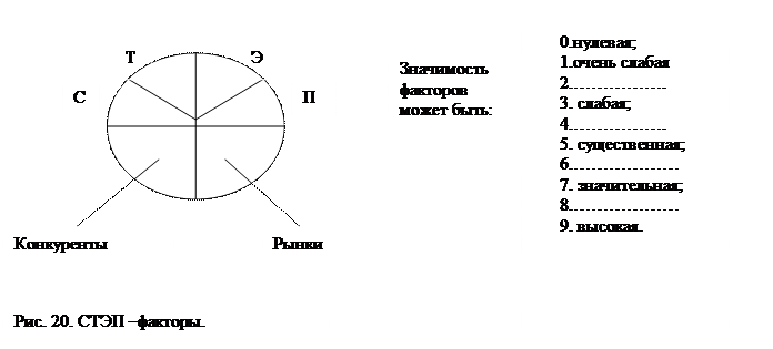 Предприятие – любой экономический объект, который либо что-то производит, либо распределяет определенные товары и услуги (соответственно производственное и коммерческое предприятие). Внешнюю среду организации можно оценить с помощью СТЭП-анализа.(анализ социальных, технологических, экономических, политических факторов, рис. 20).