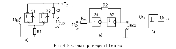 Триггер Шмидта применяется для формирования входного сигнала произвольной формы в сигналы, принимающие два стандартных уровня ”0” и “1”. Варианты схем таких формирователей показаны на рис. 4.9