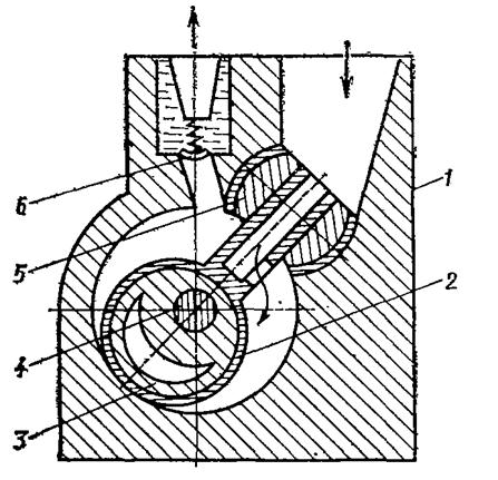 Рис. 9.15. Конструктивная схема плунжерного насоса: 1 – корпус; 2 – плунжер; 3 – эксцентрик; 4 – вал; 5 – направляющие плунжера; 6 – нагнетательный клапан