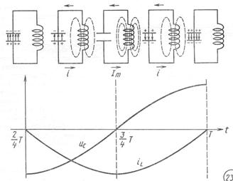 Таким образом, энергия магнитного поля тока в катушке превращается в энергию электрического поля заряженного конденсатора. Затем вновь происходит разряд конденсатора через катушку и т.д.— процесс периодически повторяется (рис. 3).