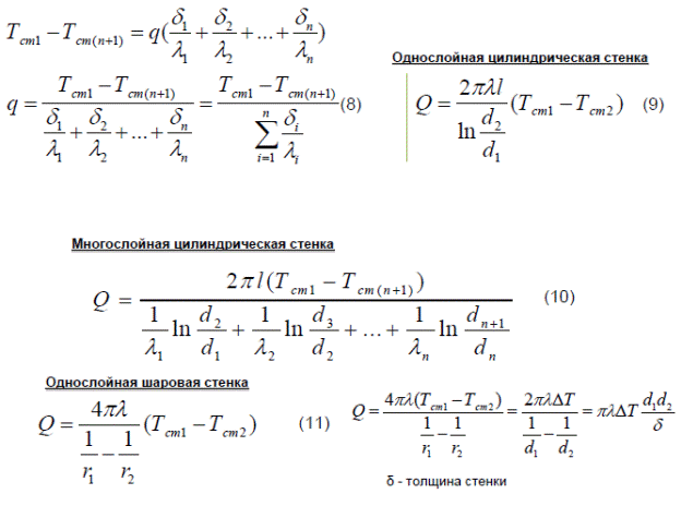 При выводе формул для многослойной стенки предполагаем, что слои плотно прилегают друг к другу, и, благодаря хорошему контакту, соприкасающиеся поверхности слоёв имеют одинаковую температуру, т.е. отсутствует скачок температур на границе раздела слоёв.