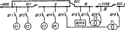 На большинстве транспортных судов с мощностью электростанции до 3 МВт и напряжением 400 В применяют СЭС с о д н о й с и с т е м о й сборных шин (рис. 1.6).