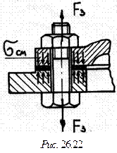 При установке болта без зазора (рис. 26.23 б) предварительная затяжка не требуется. Болт испытывает срез и смятие. Стержень болта рассчитывают на