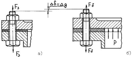 Болт затянут, а внешняя нагрузка стремится раскрыть стык (болты для крепления крышек резервуаров для газа и жидкости, нагруженные давлением выше атмосферного, крепления цилиндров, насосов, станин к фундаментам и др.). Затяжка болтов должна обеспечить герметичность соединения или нераскрытие стыка (не допустить появления зазора) под нагрузкой. Эта задача решается с учетом деформации деталей соединения.