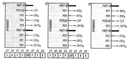Пример конфигурации ППИ в режиме 1 и соответствующее ему управляющее слово для ввода по каналам А, В, показан на рис. 3.5, а на рис. 3.5, б - для вывода. Не используемые для передачи управляющих сигналов линии РС7, РС 6 (рис. 3.5, а) и РС5, РС 4 (рис. 3.5, б) могут быть запрограммированы на ввод (D3=1) или вывод (D3=0). На рис. 3.5.в. приведен вариант конфигурации ППИ в режиме 1 для вывода информации по каналу А и ввода по каналу В. Управляющее слово этого варианта имеет вид 1010D311X, где D3 определяет работу линий РС 5, РС 4 на ввод или вывод.