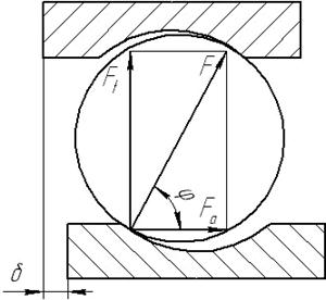 где φ – угол между силами F и Fa (рисунок 5); F – результирующая реакция, направленная перпендикулярно к контактирующей поверхности. Угол φ определяется допустимой осевой игрой δ и диаметром тел качения dW:
