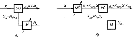 Рис. 5.5. Простейшие наборы средств измерений для реализации абсолютных непосредственных измерений: а - устройство сравнения (УС) и одноканальная регулируемая мера (М); б - устройство сравнения, одноканальная нерегулируемая мера и одноканальный регулируемый масштабный преобразователь(МП)