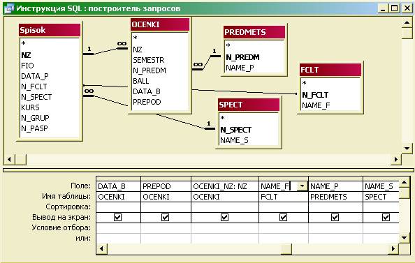 Для использования в отчете данных справочных таблиц их следует включить в Источник записей окна свойств отчета (см. рисунок 5.). После нажатия на кнопочку с изображением трех точек откроется окно Построителя запросов, которое после добавления нужных таблиц будет иметь вид, показанный на рисунке 6. Для добавления таблиц в запрос (показаны в верхней части экрана Построителя) можно воспользоваться контекстным меню. После этого нужно добавить 3 поля - NAME_F, NAME_P и NAME_S в список используемых полей в нижней части экрана. Далее следует закрыть окно Построителя запросов с сохранением изменений.