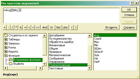 В зоны примечаний поместим вычисляемые поля, которые будут показывать средние оценки для студента, группы, факультета и для всего отчета. При создании вычисляемых полей проще всего скопировать поле BALL из зоны "Область данных" в зону "Примечание группы:", далее перейти в окно свойств этого объекта и в пункте Данные нажать на кнопку с многоточием, после чего откроется окно Построителя выражений, где можно найти в списке функций AVG (среднее) и задать выражение AVG (BALL) (см. рисунок 8).