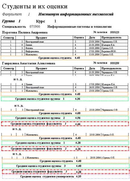 Далее следует поместить в отчет Надпись "средняя оценка студента", после чего скопировать это поле и надпись в другие зоны отчета. Вид отчета после модификации приведен на рисунке 9.