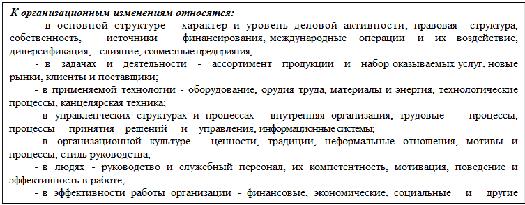 В любой организации во всех областях ее деятельности (маркетинговой, исследовательской, производственной, кадровой, коммуникационной, культурной) возникают новые элементы, связи, отношения и исчезают, преобразуются старые. Это происходит по причинам внутреннего характера или из-за воздействия внешней среды. Перемены в организациях называют по-разному: становление, развитие, реструктурирование, реорганизация, разукрупнение, слияние, кризис, упадок, крах. Общее понятие, обозначающее все эти перемены – организационные изменения. Следует, однако, отметить, что констатация стихии организационных изменений как перемен вообще (организационного хаоса) в рамках организационной теории является отправной точкой для последующего анализа.