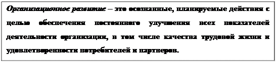 По своей сути организационное развитие это процесс обучения людей тому как надо решать проблемы, используя имеющиеся возможности. Организационное развитие фокусируется на аспектах, связанных с «человеческой стороной» организаций, и ищет пути увеличения эффективности людей, команд, индивидуальных и социальных процессов в организациях. Уникальной особенностью организационного развития является то, что занимаясь совершенствованием организации, оно также занимается развитием личности человека –сотрудника организации.[83]