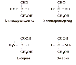 Однако в основе системы обозначения стереоизомеров лежит не вращение плоскости поляризации света, а абсолютная конфигурация молекулы стереоизомера. Для выяснения конфигурации оптически активных аминокислот их сравнивают с глицериновым альдегидом - простейшим трехуглеродным углеводом, который содержит ассимметричный атом углерода. Стереоизомеры всех хиральных соединений, независимо от направления вращения плоскости поляризации плоскополяризованного света, соответствующие по конфигурации L-глицериновому альдегиду, обозначаются буквой L, а соответствующие D-глицериновому альдегиду - буквой D. Таким образом, буквы L и D относятся к абсолютной конфигурации 4 замещающих групп при хиральном атоме "С", а не к направлению вращения плоскости поляризации.