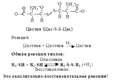 3. Серусодержащие аминокислоты. Цистеин (Цис, C) - a-амино-b-тиопропионовая кислота. Специальным свойством цистеина является способность к окислению (в присутствии кислорода) и взаимодействию с другой молекулой цистеина с образованием дисульфидной связи и нового соединения - цистина. Эта аминокислота благодаря активной -SH группе легко вступает в окислительно-восстановительные реакции, защищая клетку от действия окислителей, участвует в образовании дисульфидных мостиков, стабилизирующих структуру белков, входит в состав активного центра ферментов.