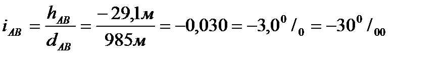 Для определения уклона находят превышение между точками по формуле (6), используя отметки, полученные в предыдущей задаче. Горизонтальное проложение линии АВ выписывают из таблицы 1, т.к. оно было найдено в первой задаче.