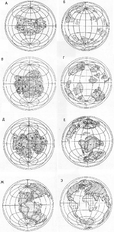 Рис. 9. Палеореконструкции положения континентов и океанов в проекции Ламберта: A – Моногея, 2,6 млрд лет назад (белым на континентах обозначен ледниковый покров); Б – распад Моногеи, 2,1 млрд лет назад; В – Мегагея Штилле, 1,8 млрд лет назад; Г – распад Мегагеи, 1,6 млрд лет назад; Д – Мезогея, 1,0 млрд лет назад; Е – раскол Мезогеи на Лавразию и Гондвану, 750 млн лет назад (белым на континентах обозначен ледниковый покров); Ж – Пангея Вегенера, 200 млн лет назад; З – современное расположение континентов и океанов [10]