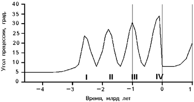 Рис. 10. Вероятные изменения угла прецессии в моменты формирования суперконтинентов: I – Моногея; II – Мегагея; III – Мезогея; IV – Пангея (будущий суперконтинент Гипергея в рассматриваемом интервале времён сформироваться ещё не успеет). Избыточные массы Моногеи, Мегагеи и Мезогеи составляли соответственно 0,7; 0,8 и 0,9 от массы Пангеи