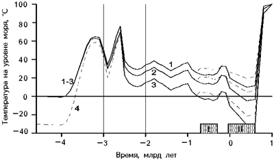 На рис. 12 вместе со средними температурами поверхности континентов и материков приведены геологические данные по распространению в истории Земли эр оледенений [17]. Как видно, после архея температура земной поверхность только снижалась, несмотря даже на возрастание светимости Солнца. Вначале, после накопления воды в Мировом океане и возникновения в раннем протерозое океанической коры современного типа, такое снижение температуры происходило благодаря связыванию углекислого газа в карбонатах, а затем (в протерозое и фанерозое) и благодаря жизнедеятельности азотфиксирующих бактерий. Похолодание земного климата даже более резкое, чем прежде, продолжится и в будущем.