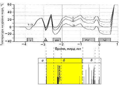 Рис. 12. Расчёт эволюции континентальных эр оледенений на Земле: температура континентов: 1 – на экваторе; 2 – средняя на поверхности континентов; 3 – на полюсах (пунктир – температура в моменты межледниковых стадиалов); I–V – эры оледенений континентов в полярных областях или на высокогориях. Внизу: эволюция оледенений по геологическим данным [17]: а – безледниковый этап, б – эпизодически ледниковый, в – периодически ледниковый (вертикалями показаны оледенения)