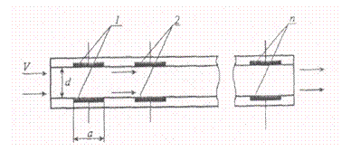 Первичный измерительный преобразователь расходомера – это трубопровод, внутри которого установлены обкладки или система обкладок конденсатора. Наиболее выгодно и целесообразно трубопровод выполнять с прямоугольным поперечным сечением. В его стенках вровень с поверхностью расположены электропроводящие обкладки конденсаторов 1, …, n (рис. 2.21).