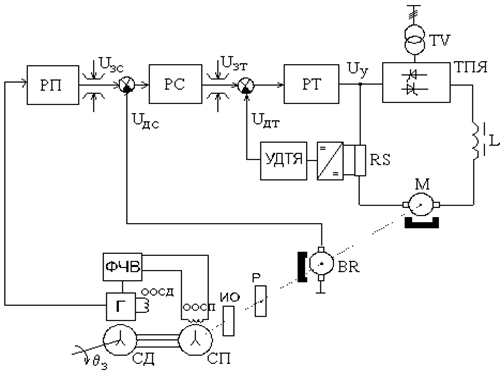Функциональная схема аналоговой позиционной системы АЭП представлена на рисунке 6.8, где приняты обозначения: РП – регулятор положения; ФЧВ – фазочувствительный выпрямитель; Г – задающий генератор (f = 400¸1000Гц); СД, СП – сельсинная пара (сельсин-датчик и сельсин-приемник); ИО – исполнительный орган; Р – редуктор с передаточным числом i.