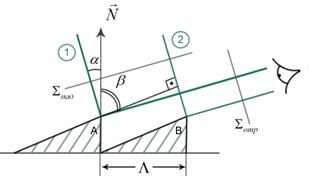 | Обозначения: N-нормаль , α - угол падения, β-угол отражения. |