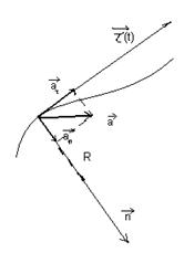 Введем систему координат в данной точке с двумя осями (два единичных вектора). Очень удобно описывать движение частицы в системе координат, когда одна ось совпадает с касательной, а другая с радиусом кривизны – естественная система координат. Она меняется по траектории, но если надо рассмотреть движение в точке или около какой-то точки, то она подходит.