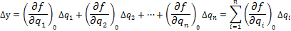 В общем случае можно записать: y=f(x1q1, q2, q3, … qn), где x - входной сигнал, qi – параметры, влияющие на результат измерений. Если они в процессе изменяются, то их влияние значительно. А так же это время отклонения от условий нормальности, геометрические размеры, неидеальность комплектующих изделий. Так как приращение ∆qi является величинами малыми по сравнению с параметрами qi, то зависимость между ∆y и первичными погрешностями можно приближенно выразить или представить с помощью полного дифференциала функции известной как формула варьирования. Тогда ∆y можно представить: