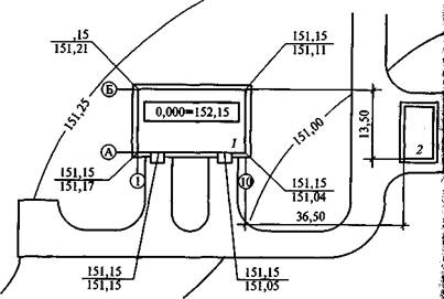 В учебном проекте допускается привязать здание к существующему рельефу озелененных территорий, т.е. вычислить черные отметки по углам здания. Планировочную отметку (красную) следует принимать по черной отметке самого высокого входа. На всех углах зданий на генплане должны быть указаны на выносных полочках вверху красные, внизу – черные отметки. В центре здания в прямоугольнике указывают абсолютную отметку, соответствующую значению 0,000 относительных отметок (рис. 2.1). Расчет проводят методом интерполяции, условно принимая рельеф местности между горизонталями в виде наклонных плоскостей.