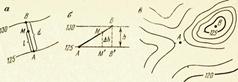 1) Зональная система плоских прямоугольных координат. При топографических съемках, маркшейдерских и инженерно-геодезических работах наиболее целесообразно применять системы плоских прямоугольных координат. Поэтому для изображения на плоскости значительных территорий земной поверхности применяются картографические проекции, дающие возможность переносить точки с поверхности эллипсоида на плоскость по определенным математическим законам. В общем случае картографические проекции вызывают искажения как углов, так и длин. В геодезии выгодно применять такие проекции эллипсоида на плоскость, которые не искажали бы углов. Подобные проекции называются равноугольными или конформными. Возникающие при этом искажения длин и площадей должны быть незначительными и учитываться простыми формулами. 2) Определение высот точек по горизонталям. Отметка точки, расположенной на горизонтали, равна отметке этой горизонтали. Если горизонталь не оцифрована, то ее отметка находится по оцифровке соседних горизонталей с учетом высоты сечения рельефа. Более общим является случай, когда точка находится между двумя горизонталями. Пусть точка М (рис. 25, а), отметку которой требуется определить, расположена между горизонталями с отметками 125 и 130 м. Через точку М проводят прямую АВ как кратчайшее расстояние между горизонталями и на плане измеряют заложение d=
