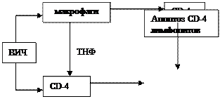 Проникнув в организм, вирус избирательно поражает СД-4+ клетки (Т-хелперы), в меньшей степени макрофаги, моноциты, нейроны, глиальные клетки. Результатом этого является развитие тяжелого иммунодефицита, преимущественно по клеточному типу, связано с тем, что интенсивность гибели CD-4 клеток под действием вируса превышает их новообразование в лимфоидной ткани. При этом количество Т-хелперов в крови прогрессивно уменьшается и соотношение Тх/Тс снижается до 0,2-0,5 (в норме 1,9-2,4). Непосредственным механизмом разрушения Т-хелперов вирусом является апоптоз, который стимулируется специфическим мембранным белком вируса р120. Важно отметить, что апоптозу подвергаются не только инфицированные вирусом Т-хелперы, то и стерильные Т-хелперы (схема 1). Отсюда следует, что одним из путей патогенетической терапии ВИЧ-инфекции является поиск средств, блокирующих апоптоз клеток на каком-то из его этапов.