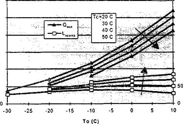 Обозначения: Qxол – холодопроизводительность холодильной установки кВт; То – температура в испарителе; Тс – температура в конденсаторе; Lком – мощность электродвигателя кВт; εХОЛ – холодильный коэффициент (Qхол / Lком); εK / εКАРНО – эффеетивность Карно, отношение холодильного коэффициента цикла холодильной установки к холодильному коэффициенту цикла Карно.