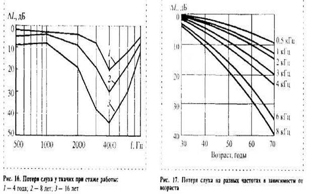 Отсюда вытекает, что если человек подвергается воздействию интенсивного шума каждый день, то ухо просто не успевает восстановиться, и тогда постепенно появляются необратимые потери слуха. При этом говорят о постоянном изменении порога слышимости или о тугоухости. По некоторым данным за 10 лет, постоянное изменение порога слышимости равно временному изменению этого порога после одной рабочей смены. Анатомически тугоухость связана с деградацией волосковых клеток, начинающейся с незначительных изменений и кончающейся их полным обрывом. Чаще всего снижение слуха развивается в течении 5- 7 лет и более. На рис. 16 представлены кривые потерь слуха у ткачих в зависимости от их стажа работы. Характерной особенностью этих кривых является то, что максимальные потери приходятся на частоту 4000 Гц. Это является общей закономерностью потерь слуха. Причины этого явления пока не вполне ясны. Часто связывают это с тем, что на эту частоту приходится максимальная интенсивность промышленных шумов. Однако в действительности это далеко не всегда так.