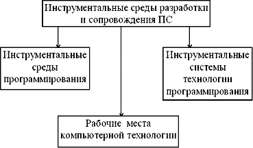 В настоящее время с каждой системой программирования связываются не отдельные инструменты (например, компилятор), а некоторая логически связанная совокупность программных и аппаратных инструментов поддерживающих разработку и сопровождение ПС на данном языке программирования или ориентированных на какую-либо конкретную предметную область. Такую совокупность будем называть инструментальной средой разработки и сопровождения ПС. Для таких инструментальных сред характерно, во-первых, использование как программных, так и аппаратных инструментов, и, во-вторых, определенная ориентация либо на конкретный язык программирования, либо на конкретную предметную область.