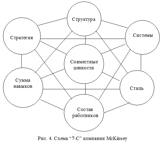 Существуют различные подходы к рассмотрению структуры основных элементов организации, могущих стать предметом исследования и преобразования. Один из наиболее известных – схема “7-С” компании McKinsey (см. рис. 4).
