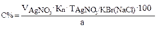 Определение титра нитрата серебра. В качестве индикатора применяют 5 % раствор хромата калия К2СгО4 в воде. Наполняют бюретку раствором нитрата серебра АgNОз. Отобрав пипеткой 10 мл 0.05 моль/л раствора NаС1, переносят ее в колбу Эрленмейера вместимостью 250 мл, добавляют 0.5 мл раствора индикатора, немного разбавляют водой и медленно титруют 0.1 моль/л раствором АgNОз, непрерывно перемешивая жидкость до появления первого неисчезающего изменения цвета суспензии. Нужно уловить момент, когда лимонно-желтый цвет суспензии приобретет от капли АgNОз слегка красноватый оттенок. Запись анализа и расчеты производят так же, как при определениях кислотно-основным методом.