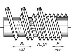 Для получения трехзаходного винта надо одновременно навивать три треугольные призмы ( рис. 20); тогда при одном обороте во время завинчивания такой винт переместится на расстояние трех шагов и, следовательно, ход трехзаходного винта будет равен 3Р ( Рh = 3Р). Отсюда, делаем вывод, что, ход многозаходной резьбы получается умножением шага на число заходов – n:
