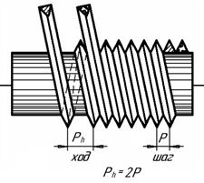 Резьбу, образованную движением двух, трех и более одинаковых профилей называют многозаходной (двух-, трехзаходной и т.д.). Для получения двухходового винта надо одновременно навивать две треугольные призмы, расположенные рядом без промежутка. Во время завинчивания такой винт за один оборот переместится на расстояние двух шагов 2Р (Рh = 2Р), т.е. ход Ph = 2Р, где 2 – число заходов (рис. 1.19).
