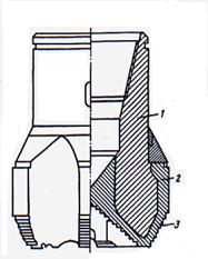 Алмазное долото состоит из стального корпуса с замковой резьбой и фасонной алмазонесущей головки (матрицы). Матрица разделена на секторы радиальными (или спиральными) промывочными каналами, которые сообщаются с полостью в корпусе долота через промывочные отверстия (рис. 13).