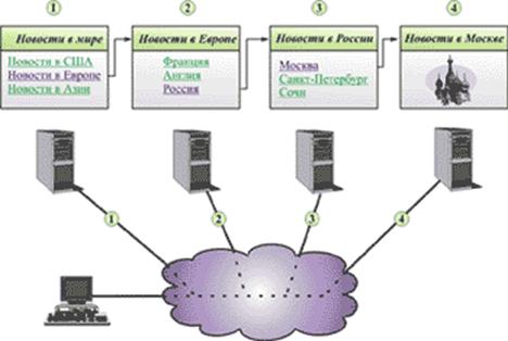 Для того чтобы лучше понять идею организации Всемирной паутины, обратимся к рис. 2, на котором показан пример использования WWW для поиска информации о новостях. Предположим, что пользователю, проживающему в США, необходимо узнать последние московские новости, и он не знает адреса сервера, на котором можно найти эту информацию. Вполне вероятно, что для того, чтобы получить необходимые данные, он набирает известный ему адрес Web-сайта, который физически расположен на компьютере в США и посвящен теме «Новости в мире». Очевидно, что на одном сервере не могут храниться данные о местных новостях всех уголков земного шара.
