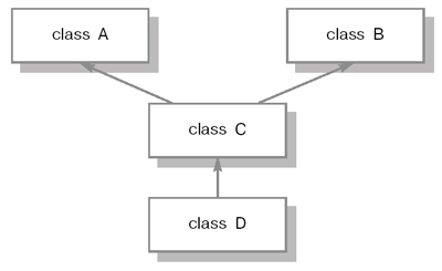В данном случае класс C наследует двум классам, A и B.