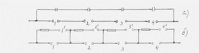 | Необходимым условием удовлетворительной работы выключателей с многократным разрывом является равномерное распределение восстанавливающего напряжения между разрывами. Для обеспечения равномерного распределения напряжения между разрывами при любой частоте восстанавливающего напряжения, целесообразно применение емкостных делителей напряжения (рис.4.1.а). Эти выключатели обычно снабжают также шунтирующими резисторами, включенными параллельно каждому разрыву (рис.4.1.6). При этом в каждом разрыве необходимы небольшие гасительные устройства (обозначены 1,2,3,4) для отключения сопровождающего тока. |