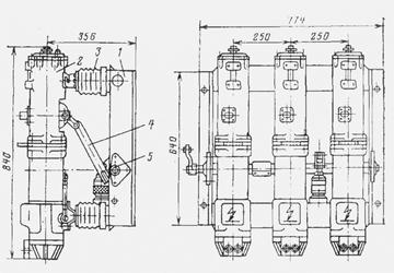 Выключатель состоит из рамы 1, к которой с помощью опорных изоляторов 3 крепятся полюсы выключателя 2. Полюсы с помощью изоляционных тяг 4 связываются с валом 5, общим для трех полюсов и установленным в раме выключателя. Включение выключателя осуществляется подачей напряжения на встроенный электромагнитный привод через контактор.
